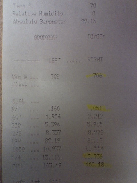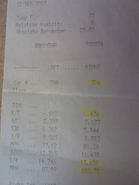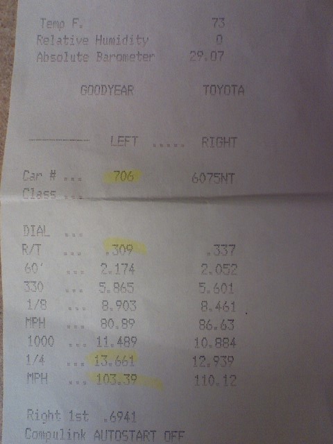 2. 34 degrees...I'll have to check for track elevation 3. Bone Stock with Drag Radials 4. 93 octane, 3/4 tank 5. No weight reduction 6. Stock 189's on the front, BBS CH's on rear with BFG Drag Radials 7. Plenty of experience drag racing 60ft 1.81 1/8 8.53 1/4 13.2@103 I will post the time slip soon. Looking to break into the twelves with nothing more than dragradials soon.