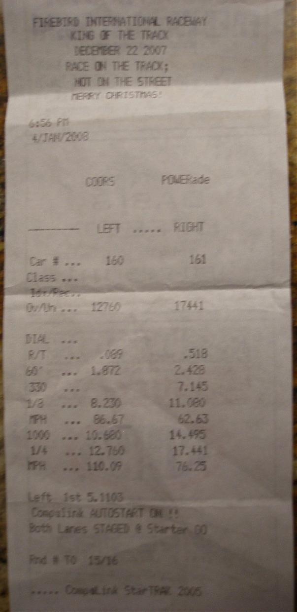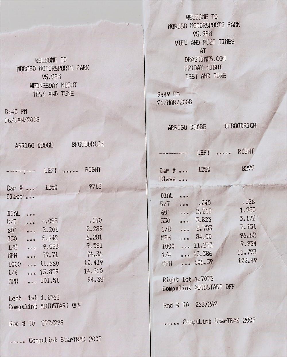 1) Model and Transmission 2) Elevation, Temp and Humidity 3) All performance modifications done to the car 4) Level of gas ran and how much gas in the tank? (ex: 93 octane and 1/4 of a tank) 5) Any weight reduction done to the car?? (ex: removal of rear seats) 4) Type of tires and rims?? (size and weight if possible) 5) Years of driving the type of transmission?? (this goes for mainly manual transmission, so if you are relatively new and are an "ok" driver let us know, this def makes a difference) 6) Obviously some type of proof of your 0-60 time, trap speed and finally quarter mile time. Preferably some video or slip or link to the drag time slip website to your direct slip. I just thought this might help to show some of the people the actual modifications and not just posting times up and nothing else.............if anyone has any other ideas to add on, join the party, this is a great idea for a sticky, it also promotes safe driving (professional track racing instead of street racing and promotes friendly competition by modifiers to push the limits) Feel free to cut and paste other peoples post with their drag slip times to get the post (hopeful sticky) in motion!!! Please DO NOT POST anything other than professional drag strip times.......... |