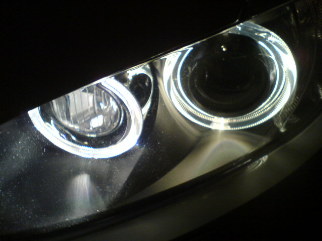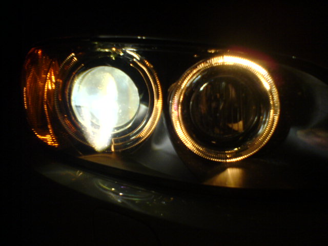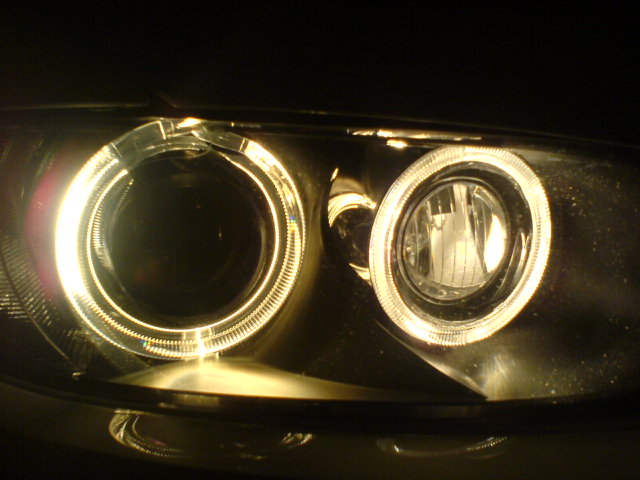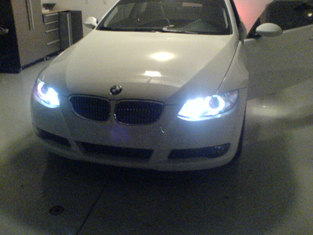 Those pics are of the angels as DRL's.(you can tell because no amber running lights) That is the reason. I have done a lot of trials with bulbs, trust me. Including running a power test of the angel eyes. When they are used in that mode, they are much brighter, no matter which bulb you use. Esspecially the inner ring. I've tried a few, the GP thunders look the best to me for the angel eyes. When they are not in the DRL mode, they are not putting out the full 35 watts,(25w I beleive my muti-meter said) hence they won't look as bright white. The good news is they should last longer. That is why I took the super whites out, and they will be suitable for the foglights. When running at the lower wattage in the angel eyes they still were not White enough for me. Super white or the hoens, both @ 4300k are a great match for the H3 cornering lights and H8 fogs, when getting full power. GP Thunders are too Blue for those applications to me. All look better than stock IMO. Last edited by JIMD1709; 01-19-2007 at 11:43 AM.. |