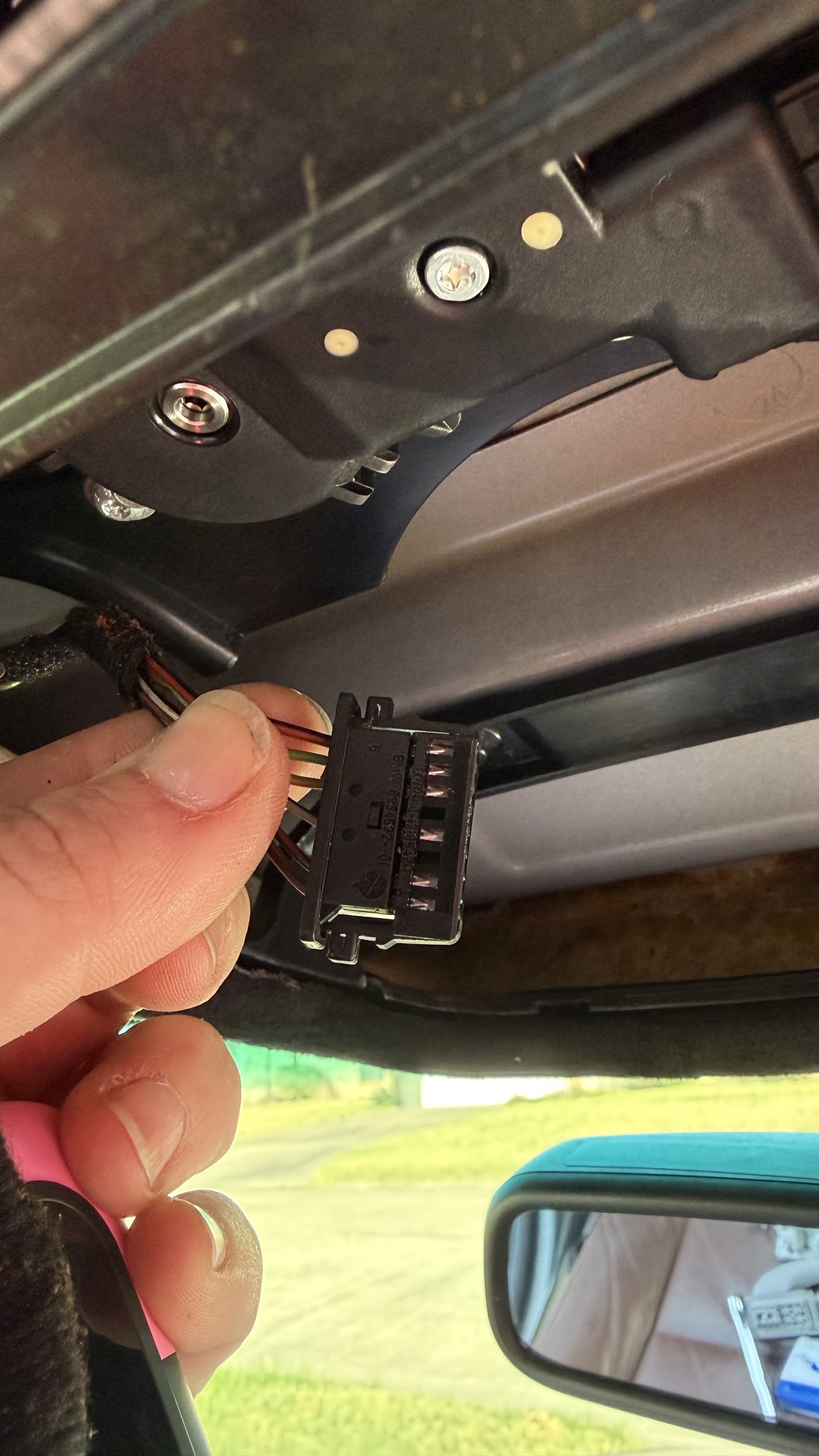 So, like every E9x the headliner fabric started to droop. It took sometime for me to get it back in, and for the love of god I cannot remember where this plug, plugs into. Or if it was even plugged in.