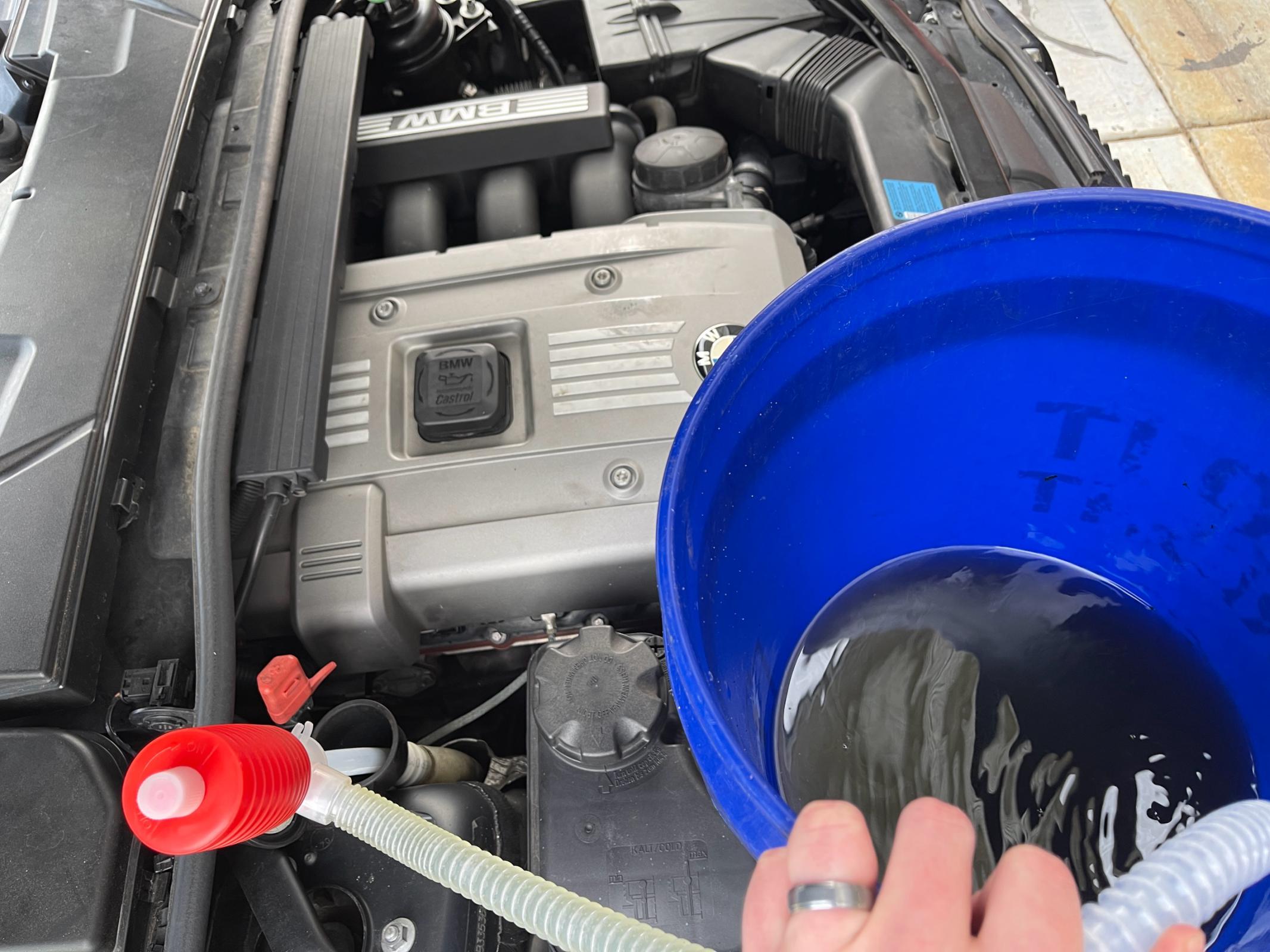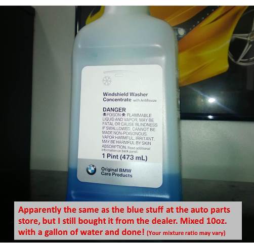 My ride (dirty, I know ): 2008 328i E90 – It should be the same for most models (E9x). Those with the headlamp washer or an E91 will have an extra pump (or two) attached to the reservoir tank. Tools Needed: -10mm socket -5/16 nut driver -Small nail or small eyeglass Philips head screwdriver (used to remove expanding rivets) Most likely you will need to replace these due to losing the center pin (Part# 51-16-1-881-149) .27c each at the dealer. -Catch basin -Jack & Jack stand -17mm socket / breaker bar for wheel removal / Torque wrench for re-install @ 88ft/lbs (Spec taken from a Bimmerfest.com post) Let's get started! 1. Remove the passenger side front wheel 2. (Fig. 1) Remove the two 5/16 screws at the top of the wheel well. 3. (Fig. 2) Remove the 5/16 screw (red arrow) and the nut (10mm – Purple arrow) 4. (Fig. 2) Remove expanding rivets (green arrows) by pushing the center pin in. I used a small eyeglass Philips screwdriver and they popped right out. 5. Now looking under the car (Fig. 3) Remove the #10 torx screw, 10mm nut and 5/16 screw. 6. Still under the car (Fig. 4) look slightly to your right and remove the remaining 3 5/16 screws on the small corner plastic cover and remove. 7. Once the small plastic cover is removed (Fig. 5) Remove the last two 10mm nuts on the bottom of the large plastic cover and remove. (It may take a little bending, but the shroud will come out with minimal effort.) 8. (Fig. 6) Remove the 10mm bolt holding in the washer reservoir. (Don’t try to pull it out yet) 9. (Fig. 7) Look to the 12:00 position in the wheel well. Slightly pull down on the tip of the tank and push up on the existing plastic shroud to free that end of the tank. 10. At this point, I emptied the remains of the tank by SLOWLY removing the filler tube (Fig. 8). This will make removal easier and prevent fluid from getting everywhere once the pump is removed. 11. Once the tank is empty; pull the reservoir tank out (There’s no need to remove the electrical wires attached to the tank – They will flex during removal) and carefully remove the electrical connection on top of the pump, then the pump itself (careful not to lose the filter tip you’re trying to clean. It will come off if you tilt the pump too far during removal. (Fig.9) 12. (Fig. 10) My research proved to be correct. The RainX seems to have caused the gummy substance on the end of the filter. 13. (Fig. 11)Clean and reinstall the filter on the end of the washer pump. Be sure to push it all the way on. You’ll get a little resistance, but it will go on. (And yes, the picture shows a bucket of dirty liquid. NO that was not just my washer fluid; there was dirt in the bucket that mixed with it )14. Reinstall the pump, attach the electrical connection and slide the reservoir tank back into the fender making sure to align the tab on the tank with the hole in the back of the fender (Fig. 12). 15. Fill the tank (I used BMW washer concentrate this time (Last Pic in the series) Your mixture will vary depending on region. Reinstall all the plastic shrouds, wheel and you are DONE. Works great now! 16. I replaced the 3 plastic expansion rivets (Part# 51-16-1-881-149) (.27 cents/ea) and purchased the washer concentrate at the same time (Part# 83-19-2-221-702 - $3.79) Disclaimer: (Hate that I have to do this) Use this DIY at your own risk, I accept no responsibility for damage you cause to your car or another person’s car you may be working on. Last edited by Nickanna; 01-03-2014 at 08:06 AM.. |