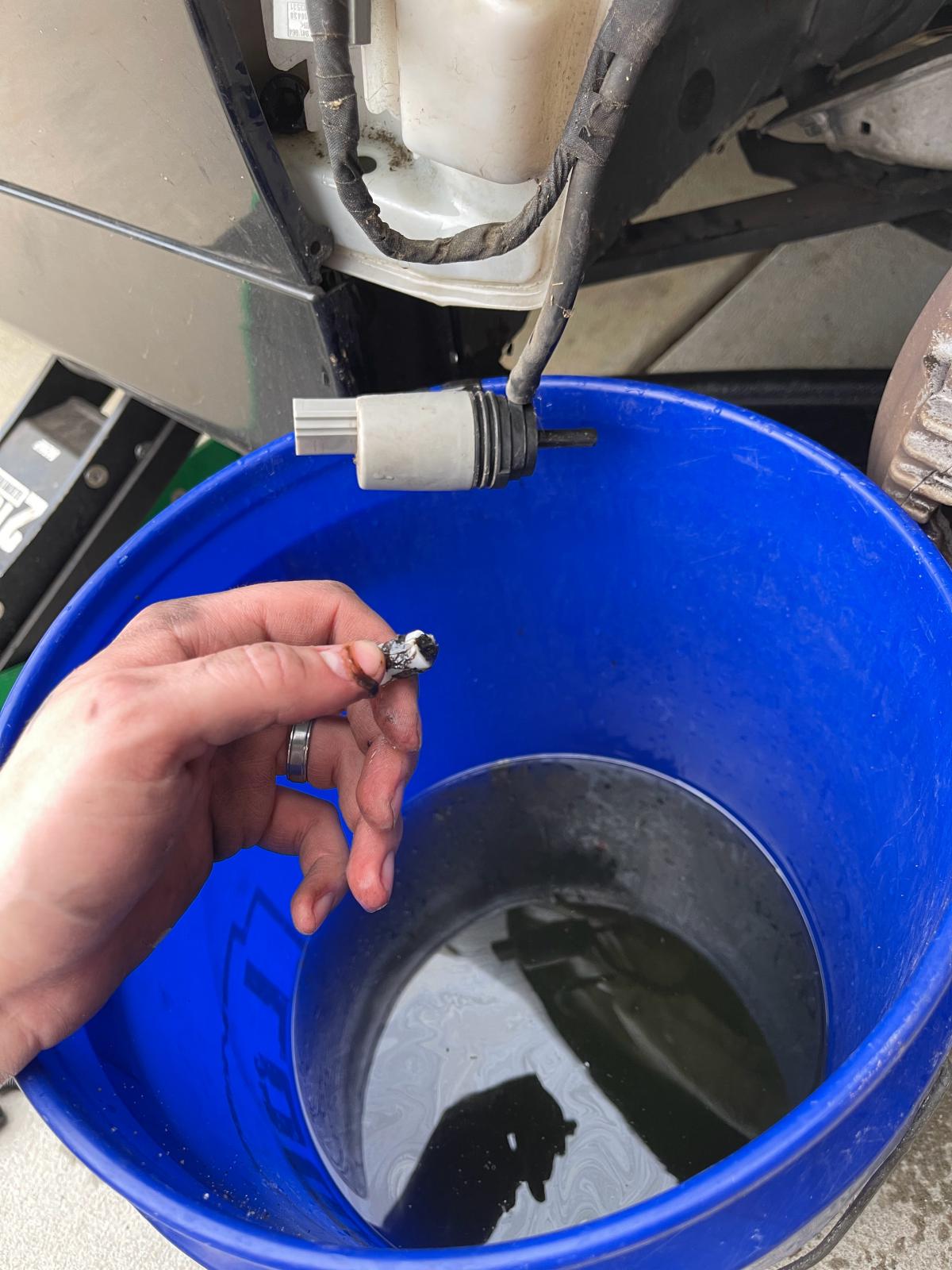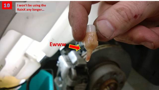 1) When I removed the filler hose, there was a FLOOD of fluid from the hose and the tank itself. This was impossible to catch because the streams were shooting opposite directions. Plan on making a mess. 2) My filter was completely clogged, so definitely start by cleaning that. 3) I had a TON of slime floating in the tank itself. It took multiple flushes with hot water and vigorous shaking to get it all out. I would highly recommend this step so your nice clean filter doesn't get clogged back up again. 4) I'd also recommend wiping out the bottom of the filler tube with a rag as there were quite a bit of slime there too. 5) I removed the cabin air filter to access the hoses near the sprayer nozzles. I blew these out with an air compressor, but there didn't seem to be any slime this far up. The filter in the tank seems to be doing its job. 6) The black tape holding the wiring for my pump and side indicator wasn't sticky anymore. I reused the old tape, and then wrapped it once with some duct tape so it would stay put.