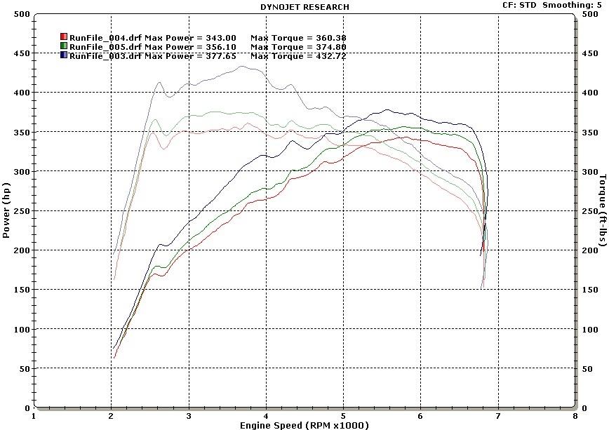 I was planning on breaking in to the 11s all turbo today, but the weather just didn't want to cooperate. Since I was already dressed up, I decided to swing by the dyno on the way back. Mods are JB, UR offroad downpipes, 2nd cats & res removed, cutouts, and ITG air filter. All runs were on ~96 octane. Correction factor 1-2%. Run 4 is the off the shelf JB2 Run 5 is the JB2 with the new downpipe/93 octane pill Run 3 is the JB2R with the new downpipe/93 octane pill Overall I was pretty happy with the numbers. I also did a run closed cutouts (stock muffler), and peak hp/tq was around 8 less. To do a quick analysis on the downpipes, I did around 323rwhp before on the JB2 91 octane, stock downpipes, stock mufflers. So I *think* the downpipes were worth around 10rwhp/15rwtq on the normal JB2. Not bad at all! Spool is much better, and the sound is a bit more tinny but not bad. Overall they are a high quality product and do perform. I don't really want to get in to a downpipe war but will be testing the Riss downpipes soon as well. The downpipe/93 pill adds around .5psi, and produced a nice gain. On the JB2R + .5psi the torque really took off, maybe too much for daily driving, but makes for a fun track curve. Not *too* lumpy... Anyway enjoy. ![]() |